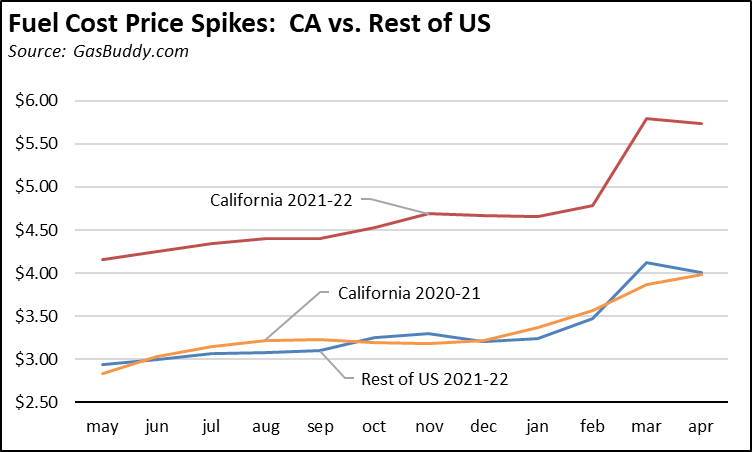 A core difference, however, is that California households have already been through the fuel price increase now being felt in the rest of the country. The following chart shows average gasoline prices in California compared to the rest of the US for comparable 12-month periods running from May to the latest data in April. As shown, the price trend households and employers faced in the current (2021-22) 12-month period is essentially the same those in California were subjected to in the previous (2020-21) 12-month period. The cost surge that is now raising understandable alarms at the federal level is something Californians have already been through without any comparable calls for relief from the state or reviews of the policies that produced it.