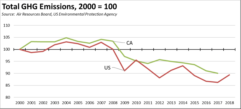 Although fluctuating more, US emission reductions have tracked somewhat better than California’s throughout this period. US emissions ticked up 3.6% in 2018 as energy-related emissions rose 3.1%. They likely dropped again in 2019 as IEA recently reported that US energy-related emissions again went down 2.9% that year, for a cumulative drop since 2000 that saw “the largest absolute decline by any country over that period.”