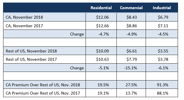 California average Commercial Price for the 12 months ended November 2018 was 16.39 cents/kWh, 61.8% higher than the US average of 10.13 cents/kWh for all states other than California. California’s commercial prices remained the 5th highest in the nation.