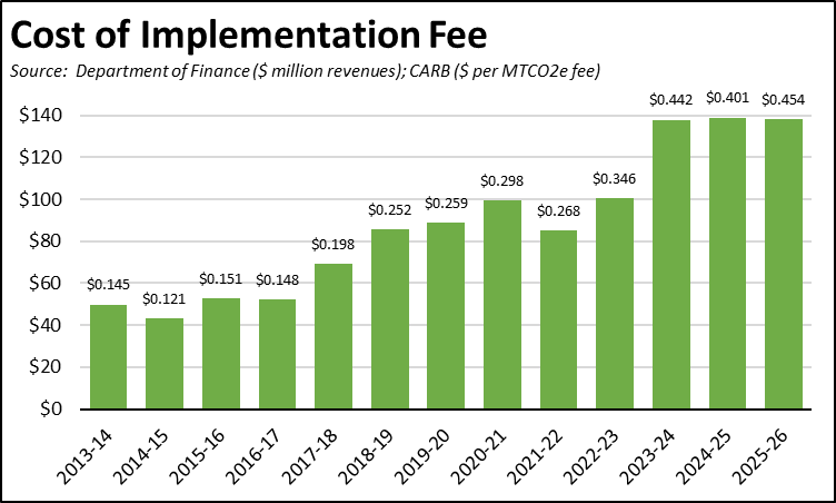 This fee has seen substantial increases in recent years. Compared to 2014-15, the fee has grown 474%, while total state revenues from this charge have grown by 421%. Based on the 2023 emissions used to calculate the current fee, about 60% of the total fee revenues contribute to the higher cost of producing and transporting fuels in this state.