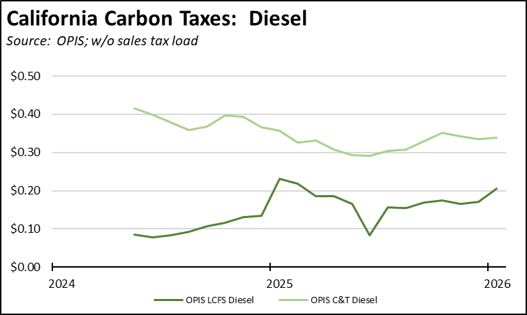 In January, total LCFS charges incorporated in the price Californians pay for fuel rose 3 cents for gasoline 4 cents for diesel, while the Cap & Trade components showed only a marginal increase. The costs shown in the table are for the penultimate month-to-date numbers from the OPIS Carbon Market Report, adjusted to incorporate state and local sales tax to account for the full additional costs imposed by these regulatory fees on fuel buyers. Certain Data or Information Provided By: Oil Price Information Service, LLC. Distribution of OPIS data without permission from OPIS is prohibited.