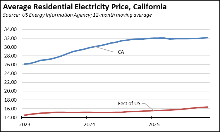 California average Residential Price for the 12 months ended November 2025 was 32.16 cents/kWh, 96.6% higher than the US average of 16.36 cents/kWh for all states other than California. California’s residential prices were the highest among the contiguous states and DC.