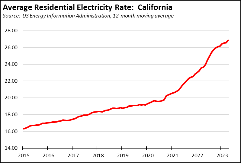 While that data has since been subject to considerable debate and revision, California’s early forays into climate change policies were largely based on this graph. And in the process, the way California has chosen to pursue those policies has produced its own version of the hockey stick graph, only this time the state-generated version illustrates the sharply rising costs being imposed on residents and employers. Looking at the residential electricity rates, the average (12-month moving average) grew annually at 3.4% through the 3rd quarter of 2020, but then spiked to an annual rate of 12.6% in the period after.