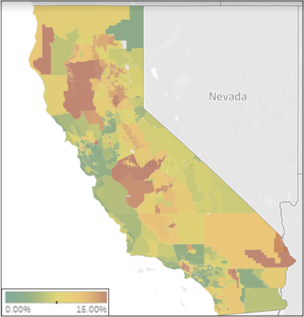 In its largely overlooked 2021 and 2022 Affordability Report, the CPUC again highlighted the increasing unaffordability of electricity bills in the Central Valley and low income portions of the state’s urban areas. The analysis is centered on calculation of an affordability ratio (AR) at different income levels, determined as the share of income required to cover the basic service electricity bill after deducting housing and other essential service (utilities) costs. In the map below, AR20 indicates the resulting affordability ratios for electricity for households in the lowest 20% income level, with 15% of income devoted to electricity taken as the unaffordability threshold. The full report also calculates ARs for other utility services and for the bundled utility services.