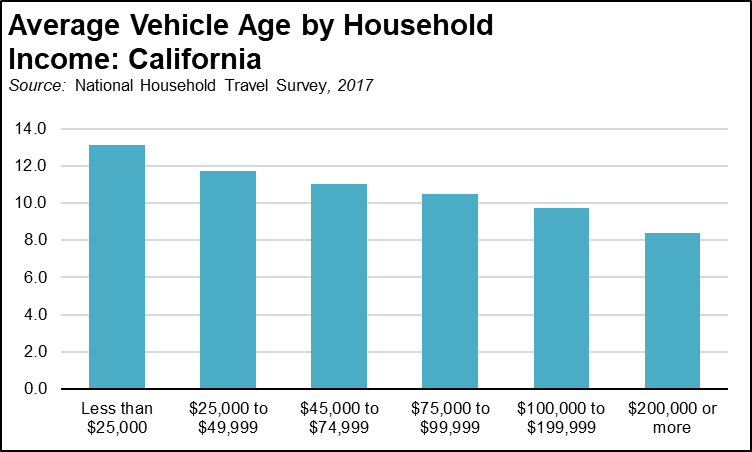 - The gasoline tax is regressive now and will become even more so in future years. Lower income households are more likely to drive older, lower mileage vehicles, and with the used electric vehicle market still yet to evolve, these are also more likely to be ICEs for the foreseeable future. In the latest data, the average vehicle owned by households earning less than $25,000 was nearly 5 years older than those in households earning $200,000 or more, while average vehicle miles traveled varies far less by income group.