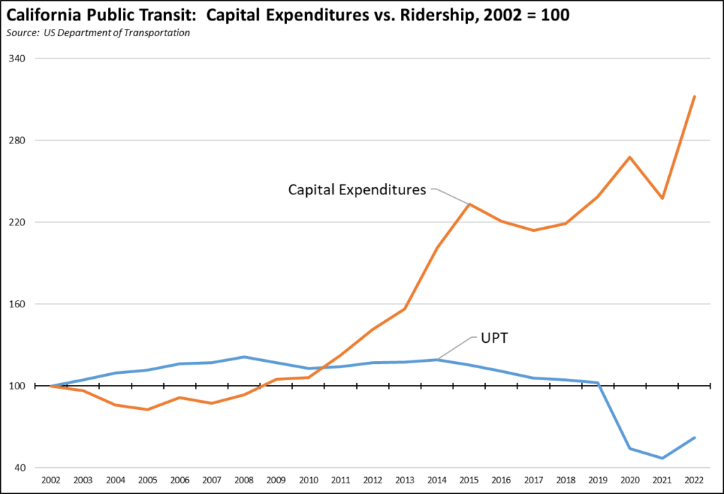 Public transit in particular has experienced declining overall use in spite of substantial and sustained investments into expanding these systems. Between 2002 and 2019, total annual capital expenditures in California grew 138% while ridership as measured by unlinked passenger trips (UPT) was basically unchanged at only 2% higher. In the most recent results for 2022, capital expenditures were 212% higher than in 2002, while UPT was 48% lower and still was struggling to recover from the pandemic plunge. The more that has been invested in these systems, the fewer the people who actually use them.