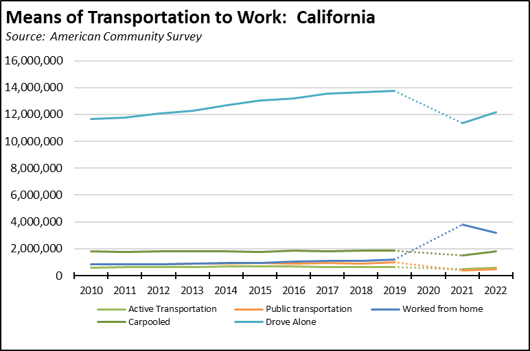 In 2017, the state fuel taxes were increased by $4.6 billion under SB 1 (Beal). During debate on the bill, legislative Republicans offered an alternative that would have raised $6 billion by relying instead on existing funds and with little impact on ongoing programs: (1) reallocate cap-and-trade fees paid through motorists, (2) truck weight fees, (3) $200 million from strategic growth funds, (4) $500 million from Caltrans efficiencies identified by LAO, (5) $685 million from eliminating one-fourth of long-term vacant state positions being used as agency slush funds, (6) $1 billion from annual general fund growth, and (7) reduced project costs from CEQA reform, public-private partnerships, and restoring Transportation Commission independence. The current surplus funds make even these changes unnecessary as revenue backfill. A Proposition 98-like reservation in fact could substitute for any new tax. - Surplus funds are now being spent on transportation modes even fewer people are using. The current budget in fact contains a significant shift of surplus general fund revenues to transportation infrastructure. Between FY 2021 to FY 2023, $7.65 billion is allocated to additional rail projects, and $1.05 billion to “active” transportation (e.g., walking, biking). The only problem is that this spending seeks to expand transportation fewer people are using every year.Using the commuting mode data from the American Community Survey, the 2022 results show 4,000 fewer people relying on “active transportation” than in 2010 when the state’s current climate change program began in spite of substantial investments in this mode. Public transportation is 326,000 lower, and carpooling only 62 persons higher. Use of single occupant vehicles in fact dropped from 84.7% of all commuters to 75.3% in 2022, but only as working from home soared from 5.2% to 17.2%.