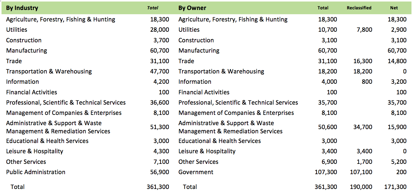 Based on preliminary estimates, there were 171,300 green/clean energy direct jobs in California in 2016, a total of 361,300 if existing government and other jobs are reclassified as green/clean energy as well. Based on the data, data sources, and methodologies—especially that used by US Bureau of Labor Statistics—contained in the prior quantification reports, a preliminary estimate by industry was developed and applied to the most recent complete Quarterly Census of Employment & Wages for California in 2016. In the table below, jobs are shown by industry, including both private and government jobs, in the first set of columns. The second set shows the estimated jobs by owner, with Government including all public jobs regardless of industry. The table also breaks out this second set to indicate which jobs represent essentially new industry components that have evolved in recent years (Net jobs) vs. those that substantially existed prior to the current state policy structure (Reclassified) such as jobs in public transit, solid waste, and other utilities.