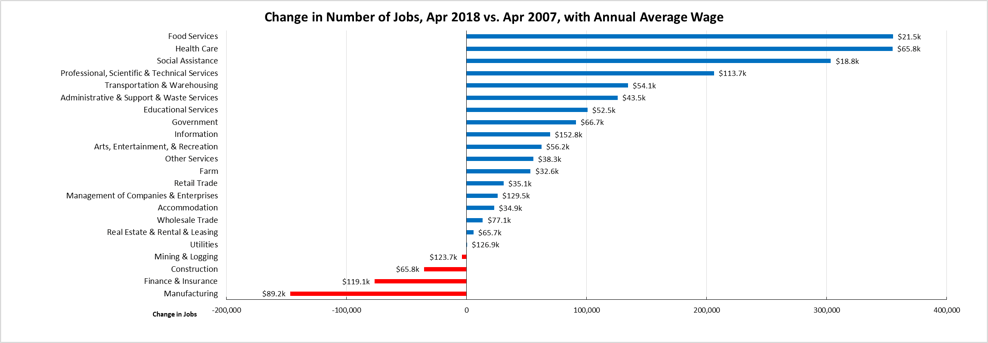 Comparing the number of jobs by industry in April 2018 (not seasonally adjusted), four industries had employment below the 2007 pre-recession levels. The highest gain industries were led by lower wage Food Services, Health Care (with a relatively higher mix of lower and higher wage occupations), lower wage Social Assistance, and higher wage Professional, Scientific & Technical Services. Of the lagging industries, three—Manufacturing, Mining & Logging, and Construction—are blue collar middle class wage industries, while the higher wage Finance & Insurance also remained in the minus column. Construction has overall improved but still remains 64,600 below the 2007 peak, and 111,100 (11%) below the previous high in 2006.