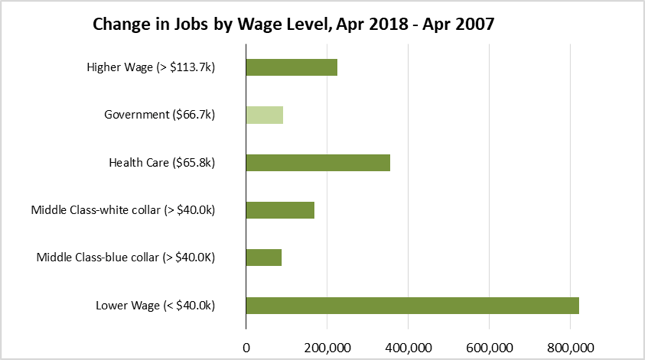 The following chart illustrates the trend for total wage and salary jobs by general wage level, according to the industry wage classification used previously in other Center analyses of this issue. As indicated, nearly half (47%) of net jobs growth since the recession has been in the lower wage industries. For the 12 months ending April 2018, lower wage industries accounted for about a quarter (26%) of new jobs, while middle class-blue collar jobs produced over a third (39%) as a result of improvements in Construction levels.