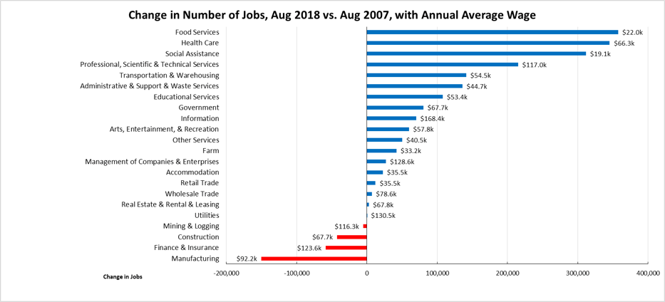 Comparing the number of jobs by industry in August 2018 (not seasonally adjusted), four industries had employment below the 2007 pre-recession levels. The highest gain industries were led by lower wage Food Services, Health Care (with a relatively higher mix of lower and higher wage occupations), lower wage Social Assistance, and higher wage Professional, Scientific & Technical Services. Of the lagging industries, three—Manufacturing, Mining & Logging, and Construction—are blue collar middle class wage industries, while the higher wage Finance & Insurance also remained in the minus column. Construction continues to improve but still remains 42,700 below the 2007 level, and 89,200 (9.2%) below the previous high in 2006.