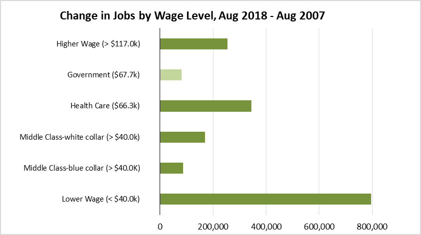 The following chart illustrates the trend for total wage and salary jobs by general wage level, according to the industry wage classification used previously in other Center analyses of this issue. As indicated, nearly half (46%) of net jobs growth since the recession has been in the lower wage industries. For the 12 months ending August 2018, lower wage industries accounted for under a third (30%) of new jobs, while middle class-blue collar jobs produced over a quarter (28%) as Construction levels remained higher compared to prior years.