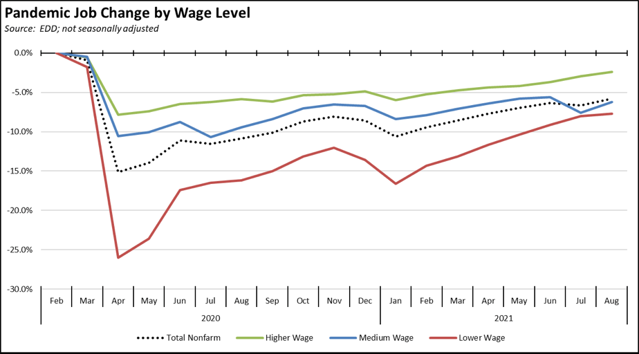The August change in jobs by wage level showed the greatest change in the middle wage industries due to the heavy concentration coming from local government education. The lower-wage jobs recovery was substantially more shallow as the result of labor shortages combined with increasing concerns over the Delta variant. The higher-wage industries continued to experience the most consistent recovery rate.