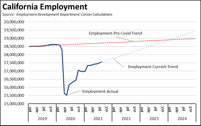 While both the jobs and employment numbers have been better in recent months, they are not yet at levels that would see quick recovery in the state economy. Continuing the rates experienced over the past 3 months would return nonfarm jobs to pre-Covid trend levels in mid-2023. The lagging recovery rate for employment would take an additional year.