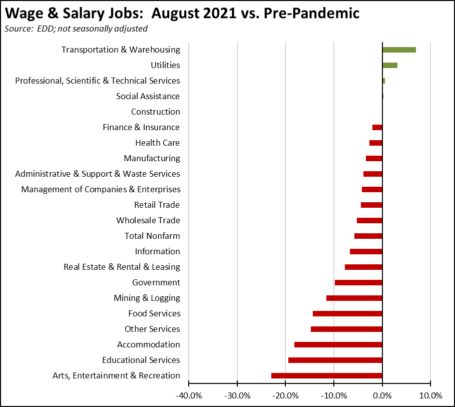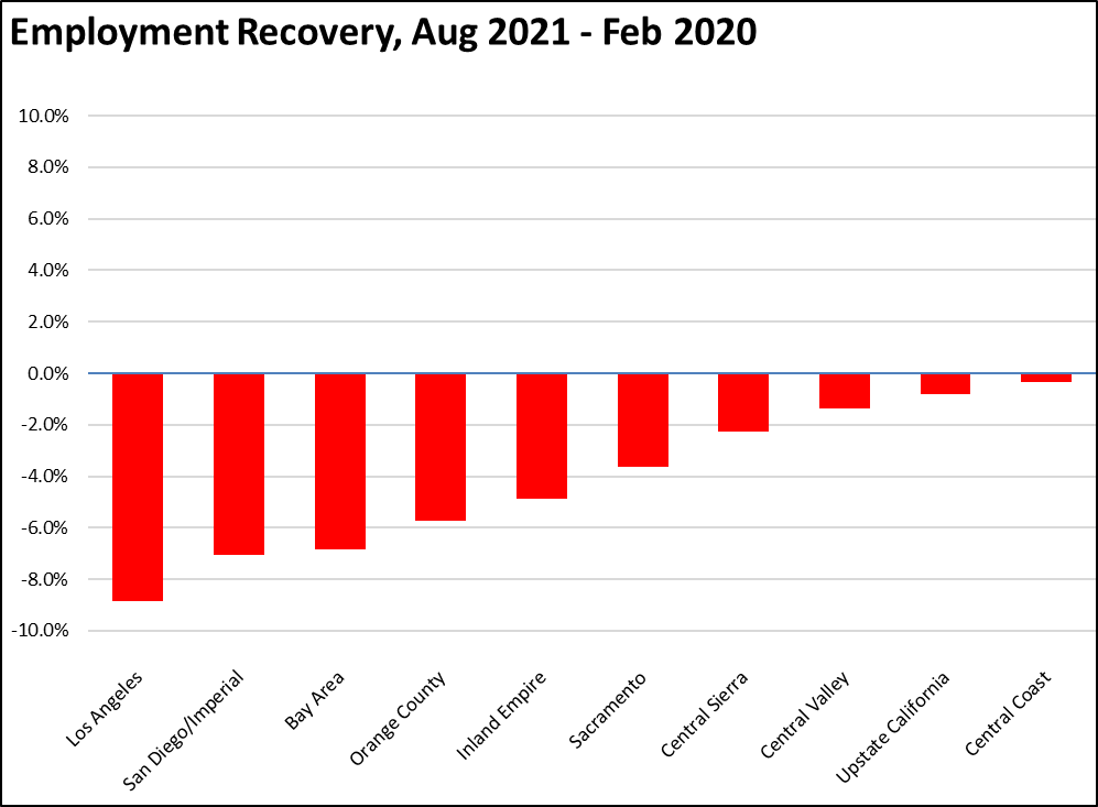 Comparing August employment to pre-pandemic February 2020, Los Angeles Region lagged behind the rest of the state in employment recovery, showing a loss of 8.9% and containing 43% of the total employment shortfall in the state compared to 29% of the total population.
