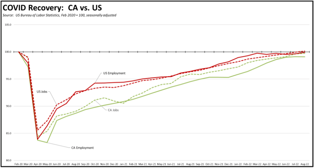 The August numbers saw a substantial weakening in the state’s recovery progress. While the US as a whole continued to post job numbers above the pre-pandemic high, the California job numbers returned to the overall weakening trend seen over the past 11 months, while employment suffered a small loss. Compared to the February 2020 pre-pandemic highs, California was still 0.3% short of the recovery mark for nonfarm wage and salary jobs, and 0.9% short for employment.
