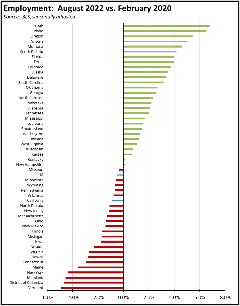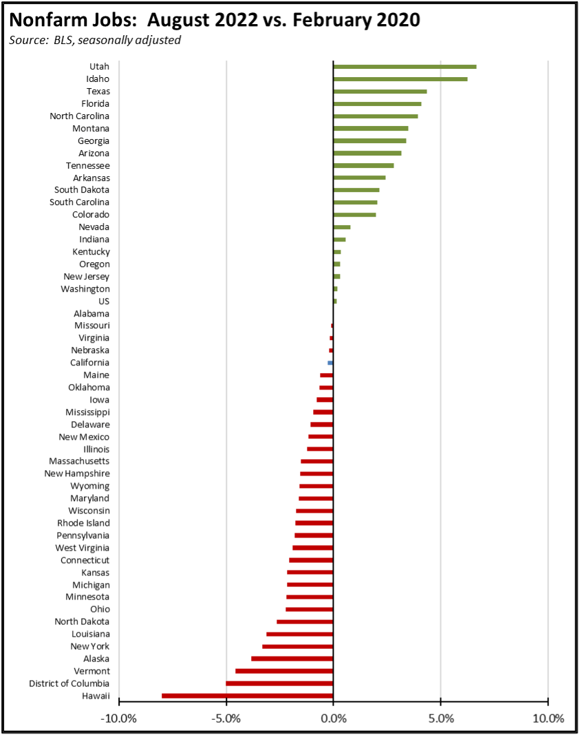 Overall, the number of states besting the pre-pandemic jobs level saw stronger improvement rising from 15 to 19. California rose only marginally to the 24th highest measured by recovery rate. The currently most vibrant portion of the national economy remains in an interior arc running from the top of the Inter-mountain to the Southeast states.