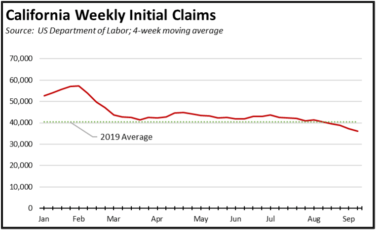 The unemployment insurance claims data began showing improvement, with the number of initial claims (4-week moving average) falling below the pre-pandemic 2019 average. In the latest results (weeks of August 27 through September 10), the weekly average was 11% below the 2019 levels. Other states continue to emphasize return to work more strongly than California’s continued focus on benefits, with initial claims in the other states substantially lower at 24% below. For the past 4 weeks ending with the week of September 10, California initial claims were 21% of the national total, while insured unemployment (a proxy for continuing claims) in the 4 weeks through the week of September 10 was 22% of the total.