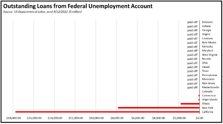 Massachusetts became the latest state to pay off its federal unemployment insurance trust fund debt, through a bond issued to both retire the debt and restore its state fund to a level sufficient to ward off state wage tax hikes. Both steps were taken in order to avoid raising taxes on employment as that state continues its recovery process. This action increasingly isolates California as the primary state relying on debt to fund its unemployment insurance program rather than using its federal pandemic recovery funds—as explicitly authorized in the appropriations—for this purpose as have other states.