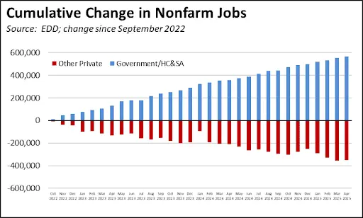 By industry, nonfarm jobs were again dominated by government and government-supported Healthcare & Social Assistance. The other private industries as a group posted a small positive result, primarily due to a seasonal uptick in activity in Construction and accelerated trade shipments in advance of the recent tariff actions. Jobs in the other private industries previously peaked in September 2022. Since then, nonfarm jobs growth has been solely in government and Healthcare & Social Assistance. Over the past 31 months, jobs largely dependent on public funding grew by 565,800, while jobs in the other private industries fell by 349,800. Even with jobs being propped up by the state’s continued deficit spending, the average monthly gain of only 7,000 coming from government-supported jobs in this period again emphasizes the extent to which the state’s economy was stagnant even before the recent actions by the federal government.