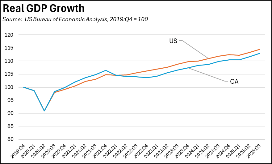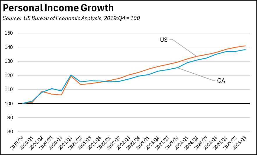 On an annualized basis, California Personal Income grew by 3.7% in Q3, higher than the US average of 3.3%. California’s growth rate was the 17th highest among the states, which were led by South Dakota (7.4%), Kansas (6.3%), and North Dakota (6.5%). California’s Personal Income in Q3 was 0.9% lower than the level estimated in the Department of Finance projections underlying the recently released Proposed Budget for 2026-27.