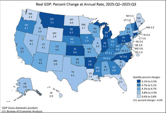 On an annualized basis, California Real GDP grew by 4.5% in Q3, marginally higher than the US average of 4.4%. California’s growth rate was the 26th highest among the states, which were led by Kansas (6.5%), South Dakota (6.3%), and Arkansas (5.8%).