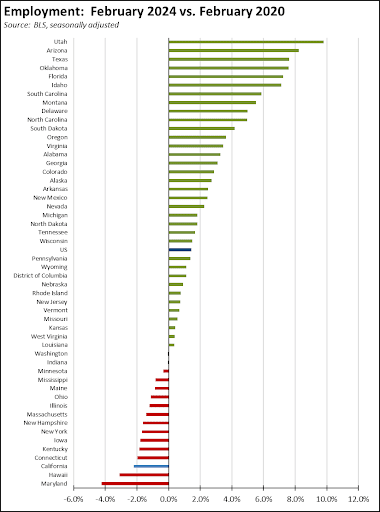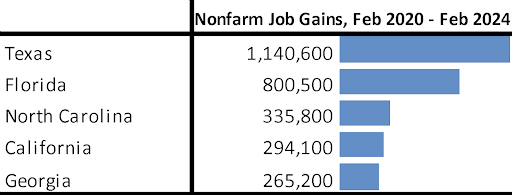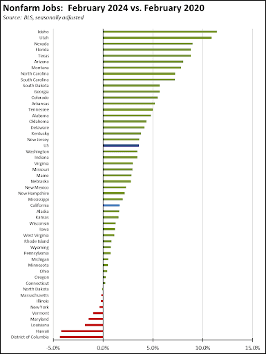Compared to the pre-pandemic peak, California has now gained 294,100 nonfarm jobs, still in 4th place among the states and DC.