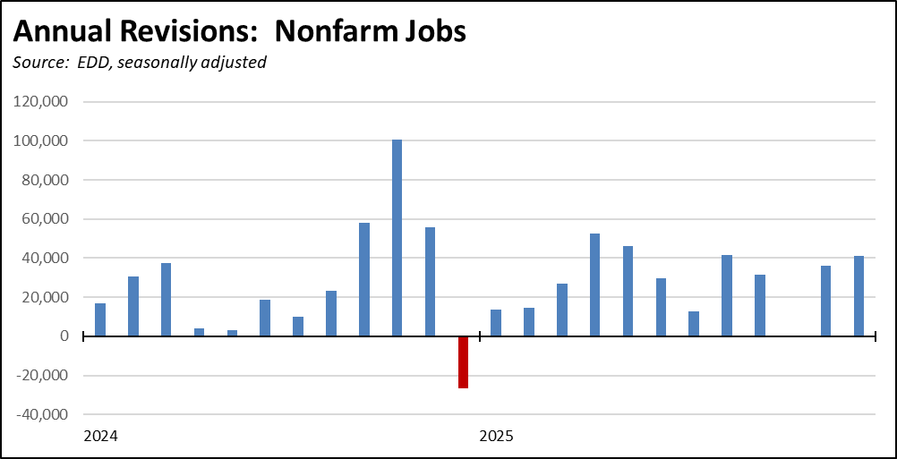 Unlike recent years, the revisions were generally positive for the state. Monthly revisions to nonfarm jobs (seasonally adjusted) were almost uniformly positive, with the March benchmark 16,700 higher. The relative adjustment, however, was small, with a monthly revision average of only 0.16% in the period shown. For the year, the preliminary loss of 11,200 jobs in 2025 was revised to a minor gain of 56,600, or only 4,700 a month.
