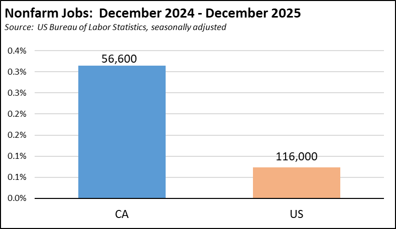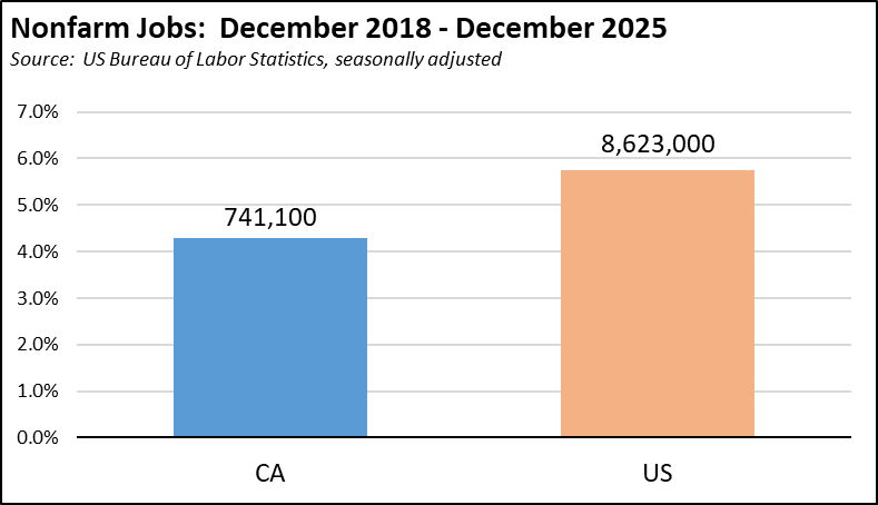 Updating the charts in our recent end-of-the-year report, the revised numbers show California’s performance in 2025 marginally improved with jobs growth of 0.3% compared to the US at 0.1%. Over the longer term since the end of 2018, California improved only slightly at jobs expansion of 4.3% compared to the US at 5.8%.