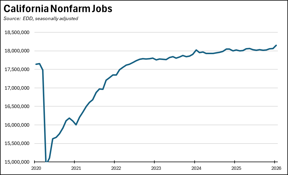The Center for Jobs and the Economy has released our initial analysis of the January employment and labor force data. The EDD and BLS releases are again on different schedules. Data for the other states will be addressed in our Full Jobs Report after it is released by Bureau of Labor Statistics next week. For additional information and data about the California economy visit www.centerforjobs.org/ca. Note that the data begins to reflect the annual revision process, with the US labor force numbers revised beginning in January 2021. The job numbers will be revised beginning with the release of January 2026 estimates.