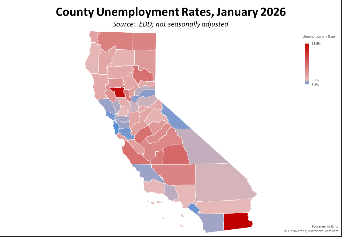 The number of counties with an unemployment rate (not seasonally adjusted) at 10% increased to 8. The unadjusted rates ranged from 3.8% in San Mateo to 18.6% in Imperial.
