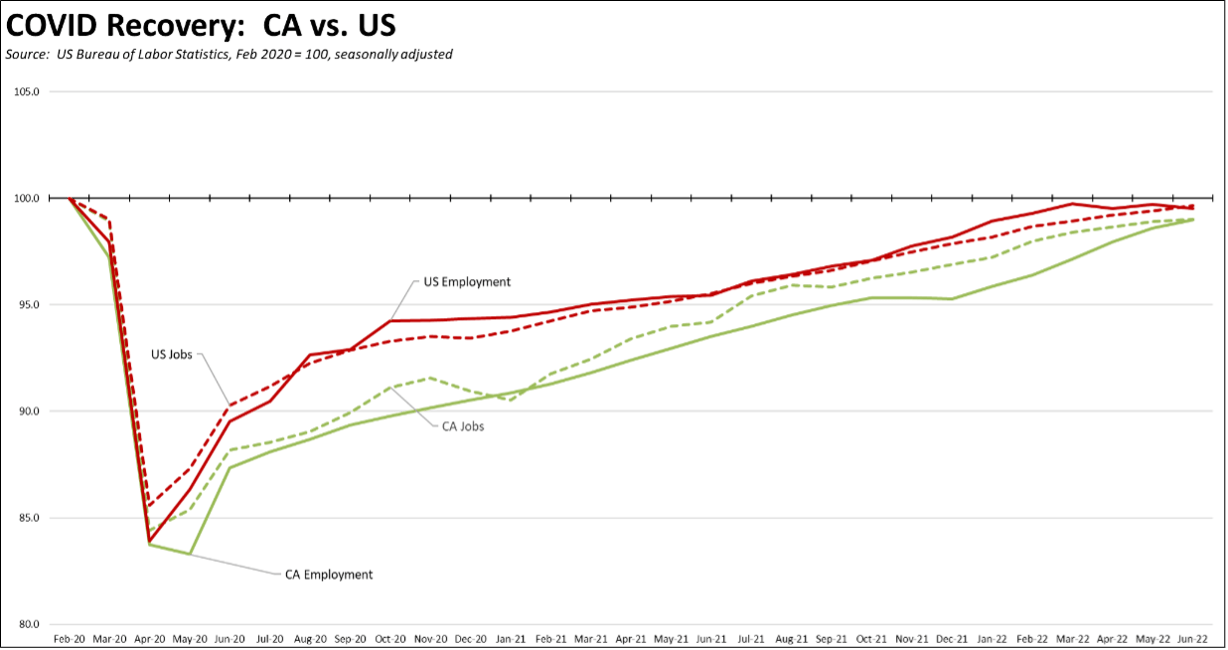 The June job and employment numbers remained positive but continued the slowing trend seen over the past 5 months. Nonfarm jobs (seasonally adjusted) came in at 1.1% below the pre-pandemic peak high in February 2020 compared to the US at 0.5% below. California continues to lag overall in recovery and accounts for one-third of the remaining jobs deficit in the nation.
