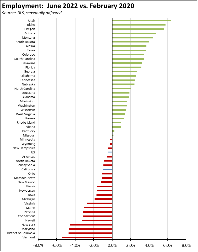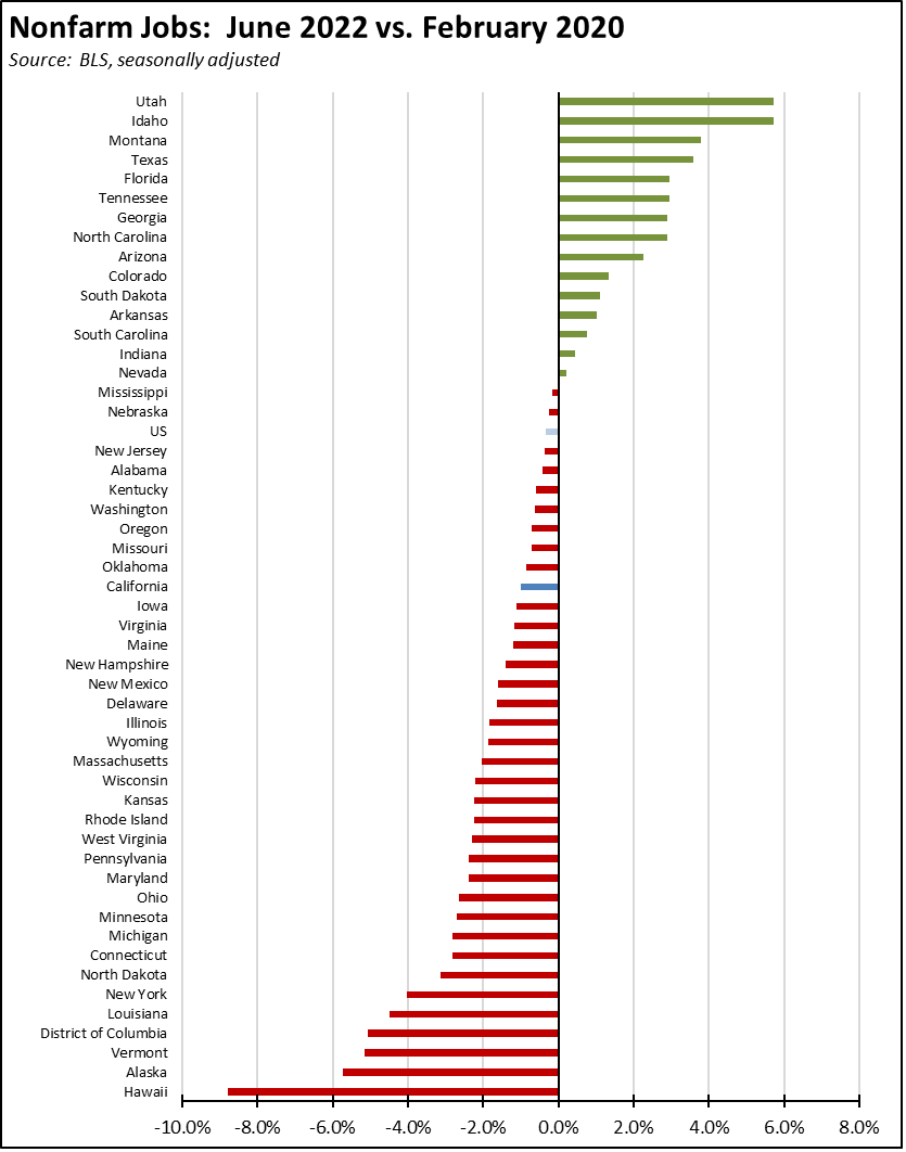 Overall, the number of states besting the pre-pandemic jobs level notched up to 15. California slipped from 23rd to 25th highest measured by recovery rate.