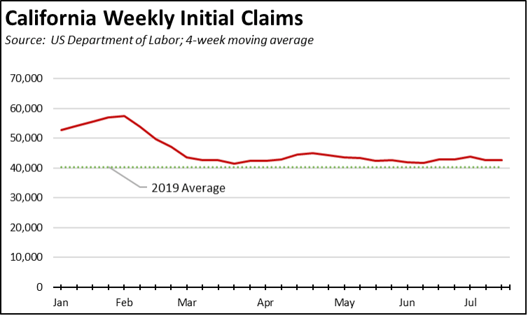 The unemployment insurance claims data also reflects this continuing lag in getting people back to work. Since April, weekly initial claims have trended about 7% above the pre-pandemic average in 2019, while the US total has trended 5% below. For the past 4 weeks ending with the week of July 16, California initial claims were 19% of the national total, while insured unemployment (a proxy for continuing claims) in the 4 weeks through the week of July 9 was 22% of the total.