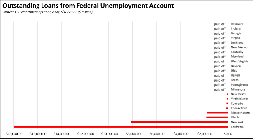 California also continues to carry by far the largest debt owed to the federal trust fund, while every other state except New York and Massachusetts has substantially reduced or paid off their debt including—as specifically authorized—use of federal pandemic assistance funds for this purpose.