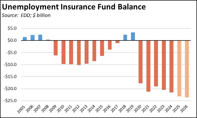 This overreliance of providing benefits to workers rather than jobs also is pushing the unemployment insurance fund further into functional bankruptcy. After diverting federal pandemic funds provided to pay off its substantial unemployment insurance debt to other uses, California remains only one of two states still carrying this debt. As a result, California employers now face rising employment taxes each year, further increasing the cost of creating new jobs. Yet in spite of rising taxes, the latest EDD forecasts only see this debt rising even further. The state’s debt to the federal government is now projected to grow from $19.1 billion at the end of the pandemic, to $23.7 billion in 2027. With unemployment remaining stubbornly high and possibly increasing if the state’s economy weakens further, the actual debt levels may increase further.