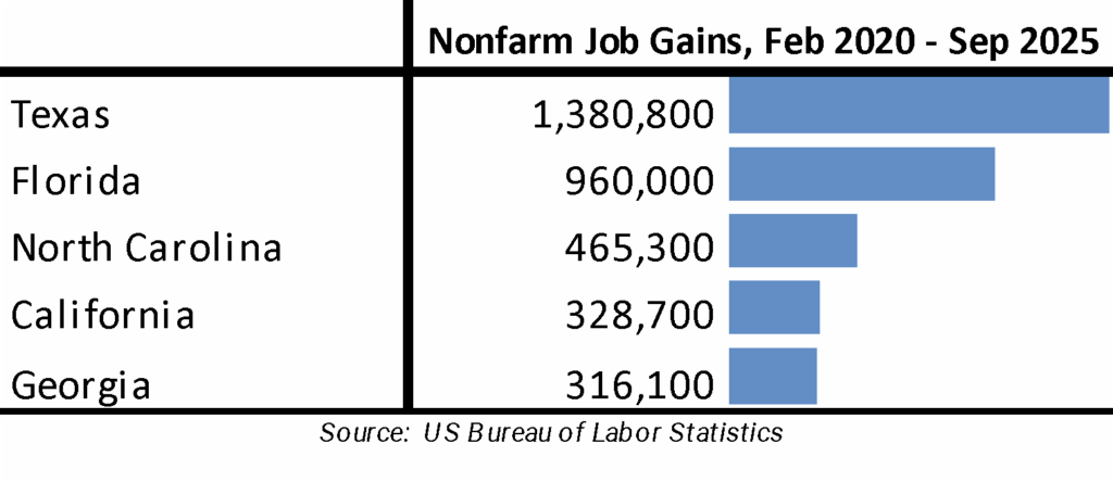 Looking at net total nonfarm job gains compared to pre-pandemic peaks, California remained in 4th place behind much smaller North Carolina and with Georgia closing the spread. California now is ahead of Georgia by only 12,600 jobs.