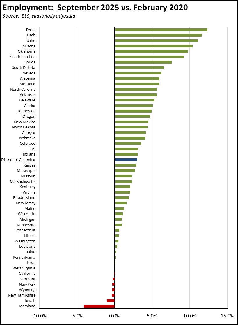 Due to the weak labor force numbers, California again remained just shy of recovery to its pre-pandemic employment levels. Adjusted by size, California’s performance was 45th highest among the states and DC.