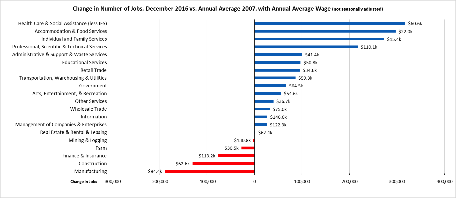 Comparing the number of jobs by industry in December 2016 (not seasonally adjusted), 5 industries had employment below the 2007 pre-recession levels. In the highest gain industries, Health Care & Social Assistance (less IFS) remained the leading industry, followed by the two lowest wage industries (Accommodation & Food Services and Individual & Family Services) and higher wage Professional, Scientific & Technical Services. Of the lagging industries, three—Manufacturing, Mining & Logging, and Construction—are blue collar middle class wage industries, while the higher wage Finance & Insurance also continued to lose ground.