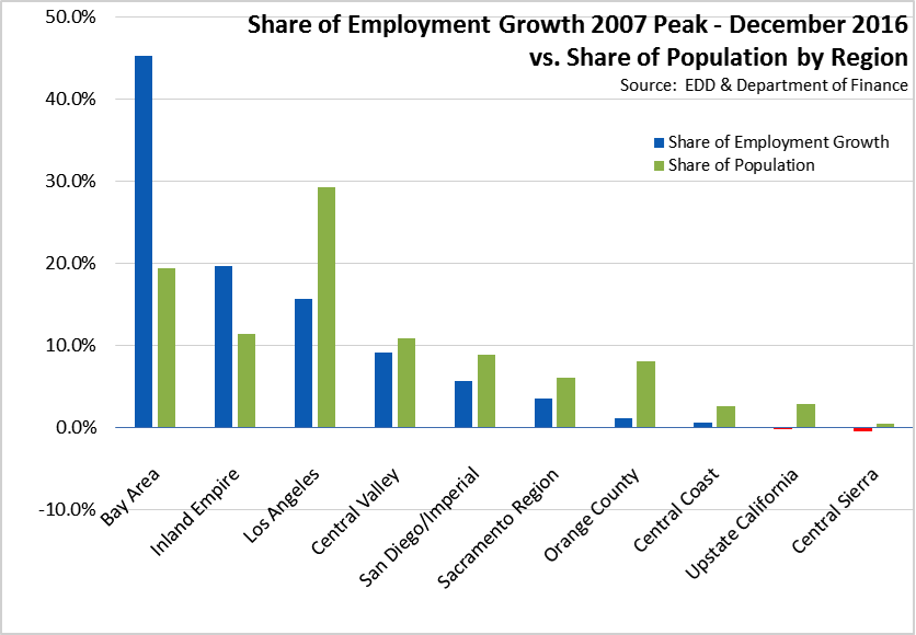Containing just under 20% of the state’s population, the Bay Area was responsible for 45.2% of the net growth in employment since the pre-recession peak in 2007. Los Angeles Region, remaining in third place behind Inland Empire, has only 15.6% of net employment gains and just under 30% of the total population.