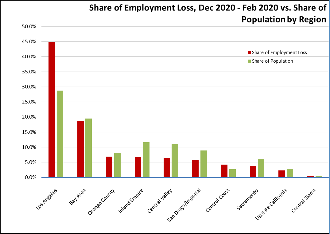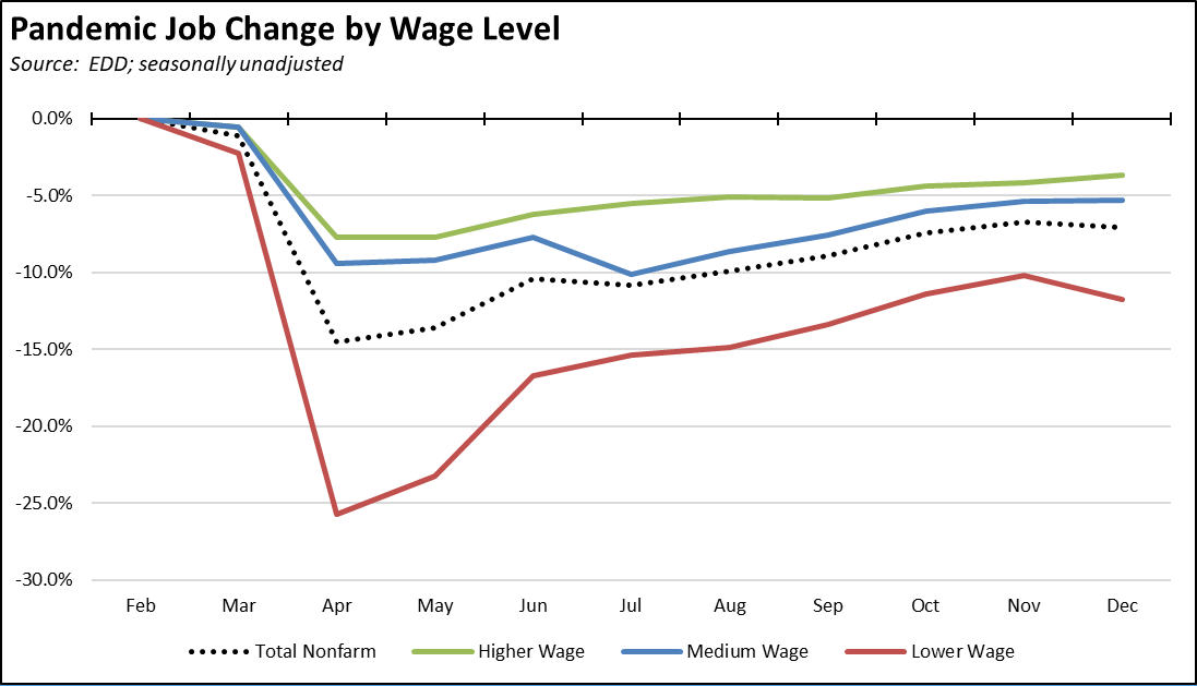 As a result of the state’s stay-at-home orders, the December results show a reversal in the state’s economic recovery during what in most other years is the peak period of jobs, sales, and cash flow essential to the continued viability of many retail and service businesses. Rather than producing the operating cash balances these businesses—especially small businesses—need to sustain operations through the coming year, the December job numbers indicate the continuing disparate effect of the state’s strategies. Jobs losses expanded within the industries already hit hardest in the current crisis, while an increasing number of higher wage industries have moved from recovery to jobs growth in large part due to the rapid shift to telecommuting. Because the surveys used to estimate the upcoming January jobs and employment data were done during the stay-at-home order period and because virtually all the unemployed are in counties that remain under the most restrictive Tier 1 classification, this trend is likely to continue in next month’s results.