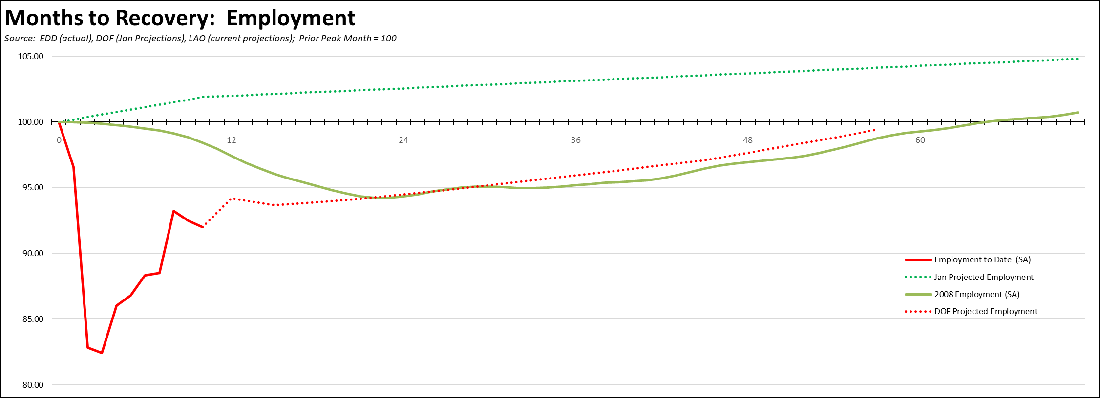 In their most recent economic projections used to develop the recently released proposed budget, Department of Finance expects the pandemic recovery to repeat in many ways the long and shallow recovery period experienced by the state after the recession that began in 2008. Both employment and jobs recovery are not expected until after the projection period, likely sometime in 2025 or later.