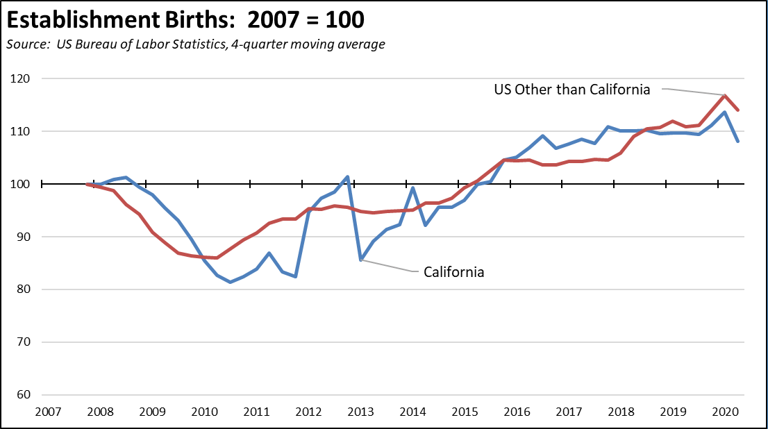 Beginning in 2014, the relative level of establishment deaths in California tracked closely with those in the other states. Following the recovery of housing prices in 2017 and 2018 that made migration more financially viable for businesses and their employees, there was an upsurge in California relative to the rest of the US through the first half of 2019. Compared to pre-housing recovery 2016, the 2018 results alone show 14,000 more establishment deaths in the state. This number is relatively small compared to the 1.6 million total private establishments in California, but it does show that even prior to the current crisis, there was some movement in the number of businesses no longer operating in the state whether because they had moved or for other reasons. At the same time, the relative pace of establishment births stalled beginning the second half of 2017 while showing a strong growth phase in the rest of the country.