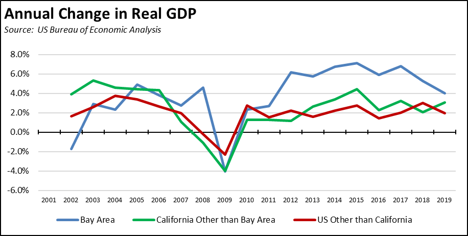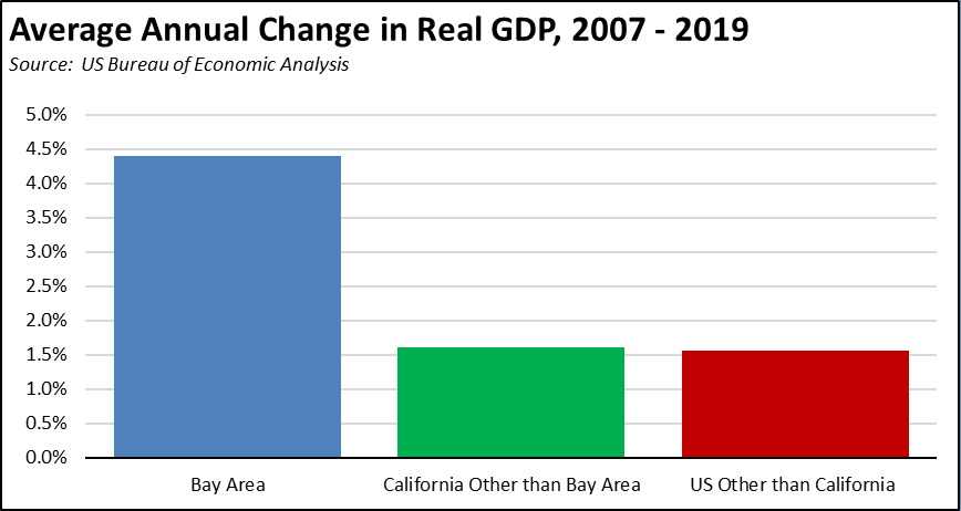 For the last two decades, the overall economic performance of California has largely been determined by the results coming out of the Bay Area. At the beginning of this period, the economic downturn coming from the Dot.Com crash was largely restricted to this region, while the rest of the state evidenced continued growth coming off the regulatory and tax reforms in the 1990s. Using the previous economic peak in 2007 as the base, average annual real GDP growth in California outside the Bay Area has matched the average in the other states. The Bay Area in sharp contrast was nearly 3 times as large.