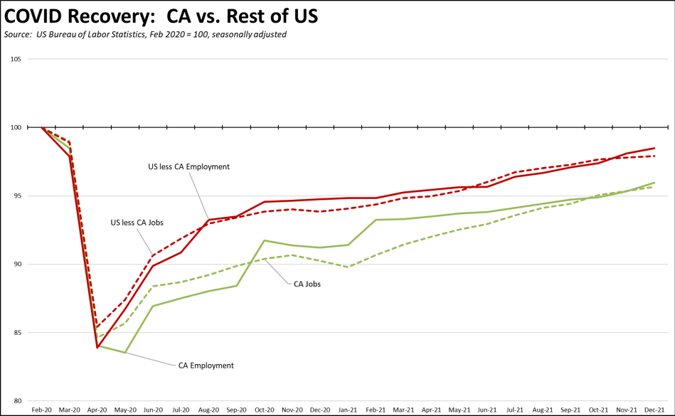 As of the December numbers, California has regained 72% of the nonfarm jobs lost to the state shutdowns. The rest of the states combined regained 86% of the jobs lost in the pandemic period.
