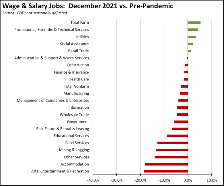 Most parts of the state’s economy remain in the recovery stage. Efforts to resolve the current supply chain disruptions continue to boost strong gains in Transportation & Warehousing, while Professional, Scientific & Professional Services continue their relatively stronger performance throughout the pandemic period. Lower wage employment in Arts, Entertainment & Recreation, Accommodation & Food Services, and Other Services continue to lead the lag, while much higher wage Mining & Logging reflects increasing state policy pressures to shrink these industries in the state.