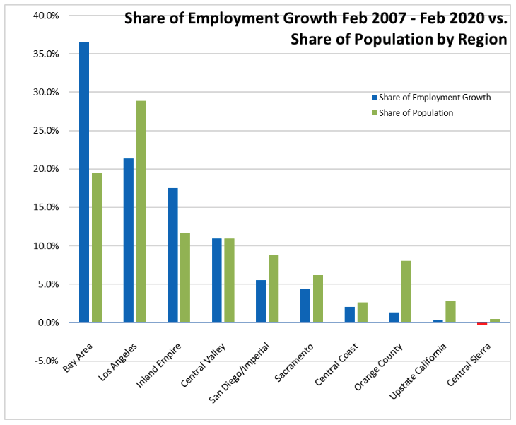 Containing 19.5% of the state’s population, the Bay Area has accounted for 36.6% of net employment growth compared to pre-recession levels. Los Angeles Region, with 28.9% of the population, accounted for only 21.4% of net employment gains. Inland Empire remains the third highest under the revised county labor force and population numbers, while Central Valley now shows equivalent growth across both metrics.