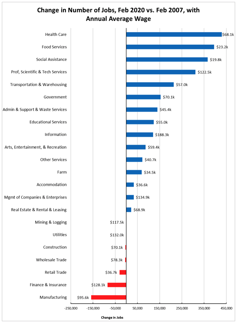Comparing current job numbers to the pre-recession levels in 2007 illustrates the structural shift in the state’s economy, with the primary jobs growth occurring in the higher and lower wage industries.
