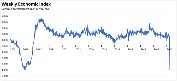 - The New York Federal Reserve Bank has created a new Weekly Economic Index to track changes in the national economy as they are occurring, to provide economic estimates in advance of the official data series. Based on weekly data, the Index indicates the change in annual GDP that would result from the weekly trends continuing for the entire quarter. For example, the Index value of -3.97 for the week of March 21 indicates annual GDP would decline by 3.97% if that week’s trends were projected over a full quarter. This is nearly the same value reached by the Index the week of February 28, 2009, just over a year into the recession that began in early 2008, an indication of how sharp the current decline in current economic activity now is. The historical series showing the sharp drop off last week is in the chart below.
