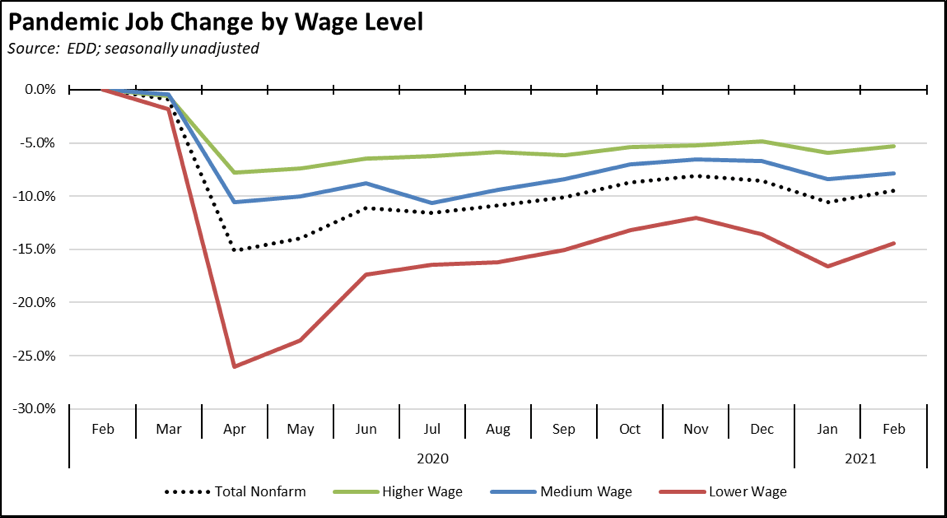 Both the job and labor force numbers while showing significant gains—with the employment results higher—still largely counter the sharp drops seen in the January results stemming from the state shelter-in-place orders. Both also fall below the previous COVID-period highs experienced last November prior to the last round of the state’s restrictions.